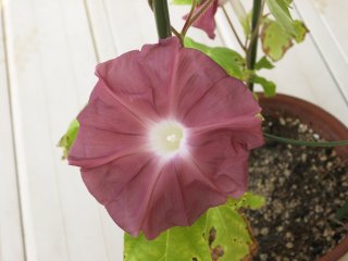 これだけ色々なアサガオを栽培していながら、意外に大輪系はあまり栽培していませんでした。しかし、知人から種子をいただいたこともあって、遅れて蒔いた「団十郎」が開花しました。昔からの人気品種ですが、確かに何とも言えない渋い色合いです。