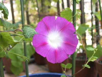 ○イポメア "スプリット・パーソナリティー" これも同じく店で輸入種子として売られていた、英国のThompson&Morganの品種です。マルバアサガオの切れ咲き品種ですが、これも花弁の切れ込みが今ひとつもの足りません。日本では、欧米と比較して栽培時の気温が高いために本来の美しさが出ないものかとも思っています。なお、葉がホコリダニの被害で少し縮れていますが、昔よりも気のせいか被害が多くなっている気がします