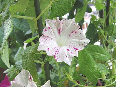 ○マルバアサガオ(有色地条斑点絞り) 種子交換でもらった品種名などがはっきりしない種子から開花したのですが、これ以外にも別の色なども咲いて、結局のところマルバアサガオの混合であることが判明しました。珍しい花というわけではなかったわけですが、これもなかなか面白い経験でした。
