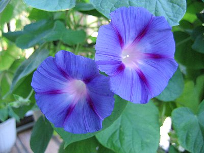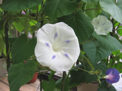今年はアサガオを例年よりたくさん栽培しているつもりですが、それでもヒルガオ科の近縁種のほうがが多いのが事実ですので、ページのタイトルは昨年までと同じにしておきます。とりあえず、2005年は大好きなアサガオの桔梗咲きからスタートとしましょう。