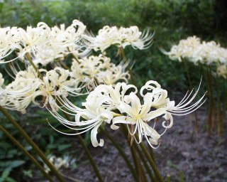 ヒガンバナとショウキランの交雑種とされ、白色の美しい花を咲かせます。ヒガンバナと同様、秋に開花した後に葉が出てきます。