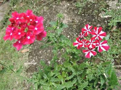 花手鞠という品種名の宿根バーベナが、枝変わりによりストライブ咲きになったものです。画像の左側にある元の花と比較すると艶やかになって鑑賞価値も向上していますが、元が登録品種なので勝手に増やすのも微妙なのが難点です。とりあえず絶やさないようにと挿し木もしてみましたが、上手く維持できるか不安です。