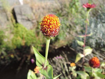 見ての通り、花弁が全く無いヒャクニチソウです。花の器官形成を説明するABCモデルにおけるB変異により花弁と雄しべがそれぞれ萼と雌しべに変化した花ということになるのですが、そんな難しい説明より単純に変な花だと見ていただければ幸いです。なお、参考までに種子はできないようです。