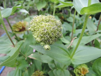 少し下に、花の器官形成を説明するABCモデルのB変異によると思われる花弁が全く無いヒャクニチソウを載せていますが、こちらはC変異によると思われる別パターンの無弁花です。どうも、キク科は花の構造が一般的な植物とは少し異なるようで、アサガオなどで牡丹咲きと呼ばれるものと同じ変異だと思われるのですが、緑色のボール状の花?となっています。こちらも種子は全くできませんでしたが、それ以前に鑑賞価値も微妙なところです。