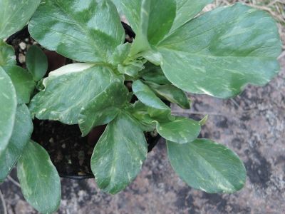 野菜のソラマメですが、斑入りとして葉に白の砂子斑が散ったものです。一応は珍しい斑入りになると思いますが、パッと見では斑入りと分からない地味な斑ですし、病気であるウイルス性の斑入りのようにも見えます。そのため採れた種子を蒔いたところ