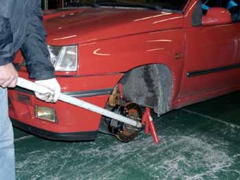 まずジャッキアップして馬を掛け、タイヤを外して、ドライブシャフトのハブナットを緩めます。
