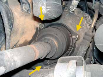 ※インナーブーツはミッションの蓋の役目もしているので必ずミッションオイルを抜いておきます、そのまま外すとオイルが流れ出ます。きちんとミッションオイルを抜いた上でインナー側ブーツを固定しているボルト3本をはずします。