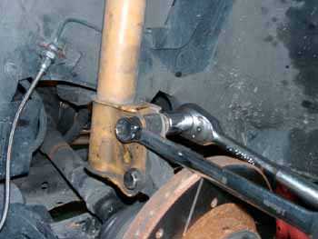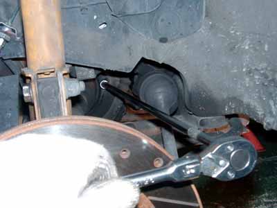 次にショックアブソーバー下側の取り付けボルトを2本とも緩め、上側のみ1本を外しドライブシャフトが少し手前に引っぱれるようにします。
