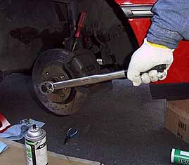 お決まりの事で、ストラット下のボルトはロアアームにジャッキを掛け多少持ち上げた状態で締めます。*足廻りのボルト類はトルクレンチを使って規定トルクで締めるようにしましょう。