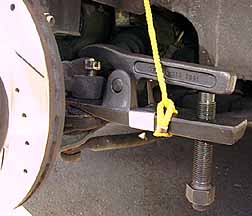 このボルトを外すには写真のような専用工具(タイロッド ・ボールジョイントプーラー)が要ります。