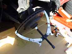 ハンマー二本で外す人も居るようですがとても素人には真似できません。ボールベアエリングのボルトを緩めて工具を掛け工具のボルトを回すと「パーン」という音とともに外れます。
