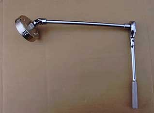 首振りラチェットハンドルにエクステンションバーをつなぎ、その先にユニバーサルジョイントを付けて、カップレンチを取り付けています。