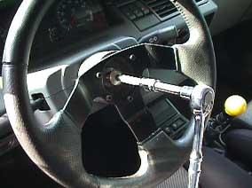 無事抜けたら新しいステアリングをさして、センターのネジを締め付けて終わり。