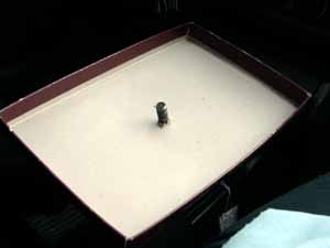 ネジの切りくずか車内に散らばらないように、お菓子の箱の蓋の真ん中の穴を開けクズ受けとしました。