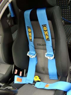 写真のシートベルトは走行会などのサーキット走行時に使うOMPの4点式です。窮屈ですがやっぱり安心感が違います。